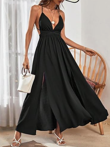 Su escote en V y los tirantes finos enmarcan el busto con sutileza, mientras que la espalda cruzada y descubierta añade un toque atrevido que no pasa desapercibido. La cintura alta estiliza la figura, y el dobladillo con doble abertura lateral aporta movimiento, frescura y un aire sofisticadamente seductor.